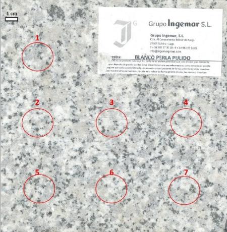 Figura 4. Ejemplo de una de las losas analizadas correspondientes al Blanco Perla comercializado por el GRUPO INGEMAR. Los círculos rojo de la imagen de la roca señalan los puntos en los que se han tomado mediciones de sus curvas espectrales. Como puede observarse, a pesar de sus diferencias, la mayor parte de los rasgos de absorción coinciden en todas las medidas.