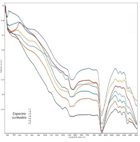 La espectroscopía de reflectancia de laboratorio consiste en obtener una medición de la respuesta espectral de la superficie de la roca ante la incidencia de la energía electromagnética en el intervalo de longitudes de onda entre los 400 y los 2500 nm, que se corresponden con las regiones del espectro electromagnético del VNIR (visible e infrarrojo cercano) y SWIR (infrarrojo de onda corta). De esta manera, las curvas espectrales permiten la identificación directa, entre otros, de los minerales de hierro como hematites, goetita, jarosita, etc. en el VNIR, y de arcillas, carbonatos, micas, sulfatos y otros minerales en el SWIR. Esta respuesta espectral se plasma en espectros (curvas espectrales) como se aprecia en la figura 2.