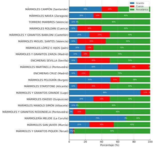 1.- ¿Qué porcentaje de GRANITO, CUARZO y PORCELÁNICO utilizan para la elaboración de encimeras de cocina?