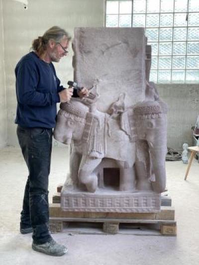 Bildhauer des Bamberger Natursteinwerks bei der Arbeit an einer Elefantenkapelle