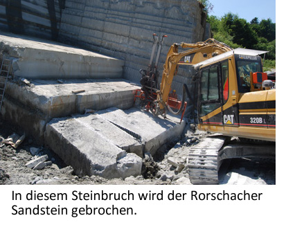 Der Rorschacher Sandstein ist ein feinkörniges, sehr homogenes graues Material mit einem leichten Stich ins Grünliche. Er eignet sich für fast alle Innen- und Außenanwendungen. Im Steinbruch der Firma Bärlocher in Staad bei Rorschach am Bodensee werden mittels modernster Diamantseiltechnik jährlich über 10‘000 m3 Sandstein abgebaut. Ein elektrisch betriebenes Endlos-Seil schneidet zunächst häusergroße Blöcke aus der Bruchwand; danach fügt man in die schmalen Vertikalschlitze mehrere pneumatische Stahlkissen ein, setzt diese unter Druck und bringt so den Steinkoloss zum Einsturz. Aufgrund der Schichtung zerfällt dieser in mehrere, noch immer mächtige Blöcke. Pneumatische Bohrer zerkleinern sie auf das zur Weiterverarbeitung gewünschte Blockmaß. Auf CNC-gesteuerten Fräsen und verschiedenen Oberflächenbearbeitungsmaschinen entstehen im Werk schließlich die Fertigprodukte. __________________________________________________________________________________________