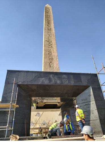 -Special challenges in the project. Installing the stone works over the inclined steel structure (Main building north facades consisting of just concrete beams, HMMJV created the substructure design, delivered and installed the steel substructure, and cladded mechanically with Teriesta stone on the executed steel structure), executing the stilettos (3 mega structure pipes where provided and HMMJV created the substructure design and installed in between and the 3 pipes were changed to a 3 faces cone 2 of them are cladded mechanically with Teriesta stone), and perfecting the alignment of the facades was from the hardest challenges, installation of 1494mm x 640mm thickness 110mm Verdi granite stone on post tension precast concrete beams at the Main Building Grand stairs), cladding of the hanging Obelisk with engraved double black stone, etc...