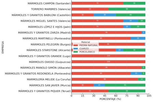 Porcentajes de materiales empleados en la elaboración de encimeras