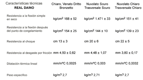 Real Daino se presenta en diferentes variedades. Puede ser con vetas o sin vetas. La variedad sin vetas se denomina CLARO CLASSICO. La variedad con vetas puede tener vetas lineales (variedad denominada VENATO) o vetas con movimiento (esta variedad se denomina NUVOLATO). Todas ellas son de color beige, aunque los tonos pueden variar de claro a oscuro.